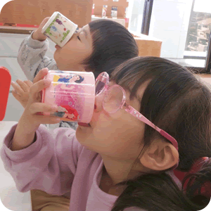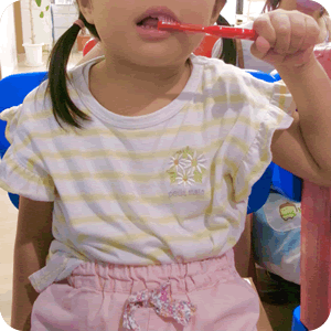 からふるでは、食後に歯みがきの時間を設けています。歯を磨くだけではなく、その後の含みうがいや喉うがいも、その子の段階に合わせて練習し、獲得していけるように支援しています。