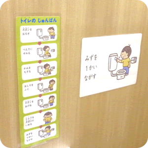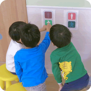 トイレを明るく温かい雰囲気にするために、子どもたちの好きなキャラクターや乗り物、動物などのイラストを貼って、思わず入りたくなるような環境づくりをしています。排泄をする際の手順がわかるようイラストを表示し、一人ひとりに合わせた援助、視覚支援を行っています。