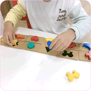 箸や鉛筆などの細かい動きが必要な活動の土台作りを行います。両手が上手に動かせるよう紐通しやシール貼り、プットインなどの課題に取り組んでいます。